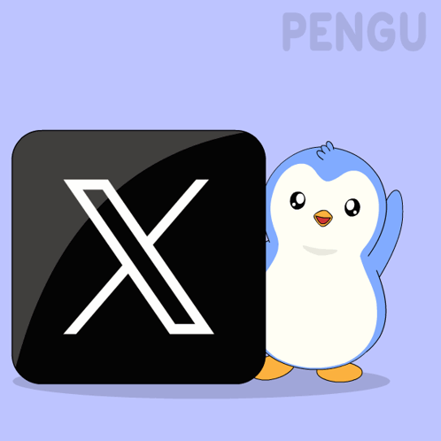 A cute Pengu penguin waves cheerfully next to the iconic black X (formerly Twitter) logo.
