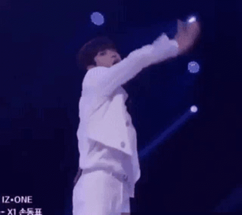 X1 member Son Dongpyo delivers a dynamic dance performance on stage in a white suit.