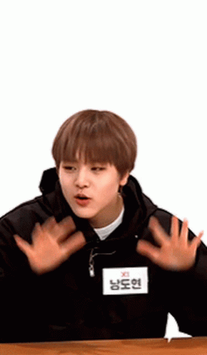 Nam Dohyon from X1 sitting at a table, gesturing with his hands during Xone.