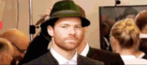 Xabi Alonso smiles, wearing a traditional green hat with feathers and a suit.