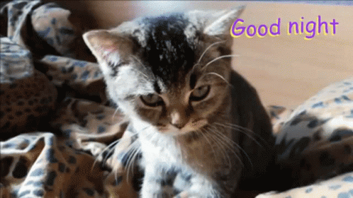 A cute kitten named Халееси curls up on a patterned blanket to go to sleep, with a "Good night" message.
