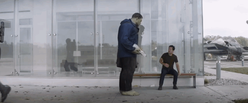Professor Hulk stands with Ant-Man, sharing food on a bench.