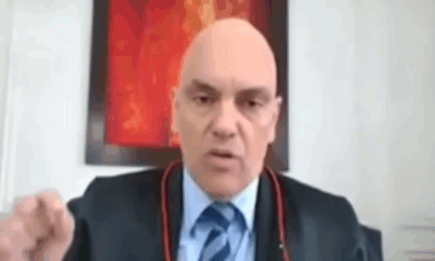 Alexandre De Moraes (Xandão), a bald man in a suit, smiles and gestures while speaking in front of a red painting.