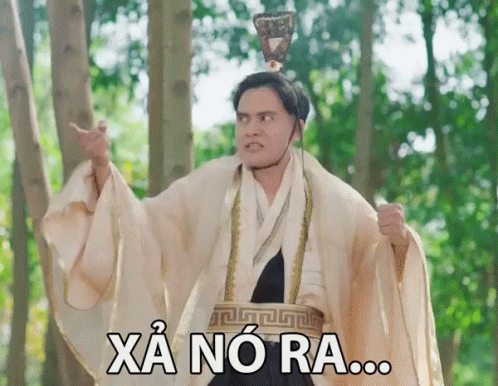 Man in traditional Vietnamese costume making a funny face, pointing, with the phrase 'Xả Nó Ra...' (Let It Go) and 'đi Tè' (to pee) context.