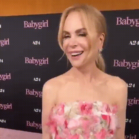 Nicole Kidman smiles and laughs in a pink floral dress at a promotional event for the movie 'Babygirl'.