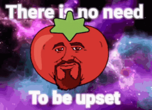 The iconic Rand Tomato meme with a beard, delivering the reassuring message: 'There is no need To be upset'.