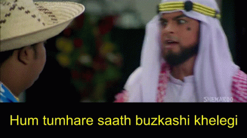 Sahil Khan and Sharman Joshi in a scene from the movie Xcuse Me, with the dialogue 'Hum tumhare saath buzkashi khelegi'.