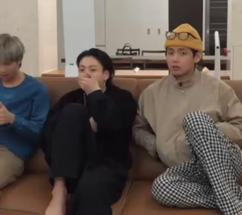 BTS members Jungkook and V react with surprise while sitting on a couch, creating a popular meme.