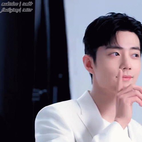 Xiao Zhan makes a playful gesture, touching his face with his finger in a white suit.