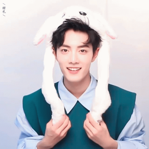Xiao Zhan smiling brightly while wearing a cute white bunny ears hat.