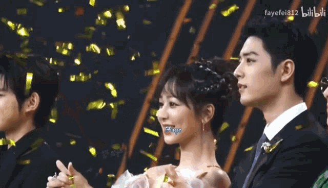 Xiao Zhan and Yang Zi smiling brightly as golden confetti falls around them at an event.