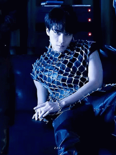 WayV's Xiaojun poses intensely on a dark couch, wearing a unique mesh top and leather pants.