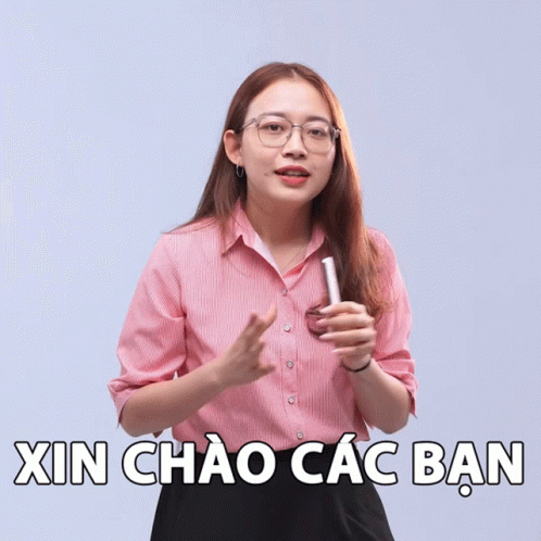 Hạnh Chee in a pink striped shirt and glasses, holding a phone, smiles and says "Hello Everyone".
