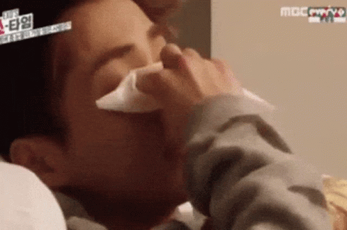 Xiumin from Exo is seen in a close-up, wiping away tears with a tissue, appearing to be deeply emotional or crying.