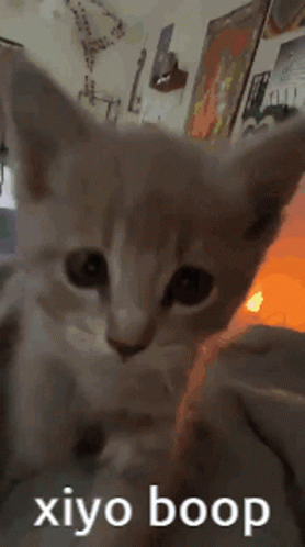 A cute Xiyo Kitty looking at the camera with 'xiyo boop' text on screen, set against a warm orange glow.
