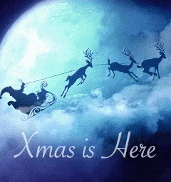 Santa Claus flying through the night sky in his sleigh, pulled by his reindeer, with the text 'Xmas is Here'.