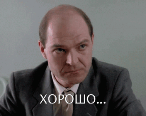 A bald man in a suit looks at the camera with a thoughtful expression, displaying the Russian word 'хорошо'.