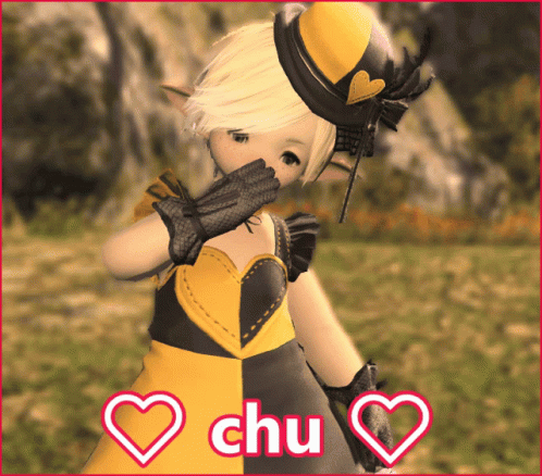 A cute Lalafell character from Final Fantasy XIV blows an adorable kiss, with "chu" text and hearts.