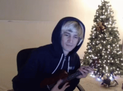 Xqc (Félix Lengyel) plays ukulele by a Christmas tree.