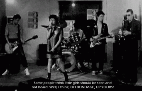 Xray Spex performing live, featuring Poly Styrene's iconic 'Oh Bondage, Up Yours!' quote on screen.