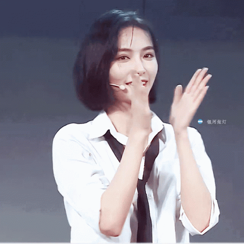 Xu Jiaqi, wearing a white shirt and tie, smiles and claps her hands on stage.