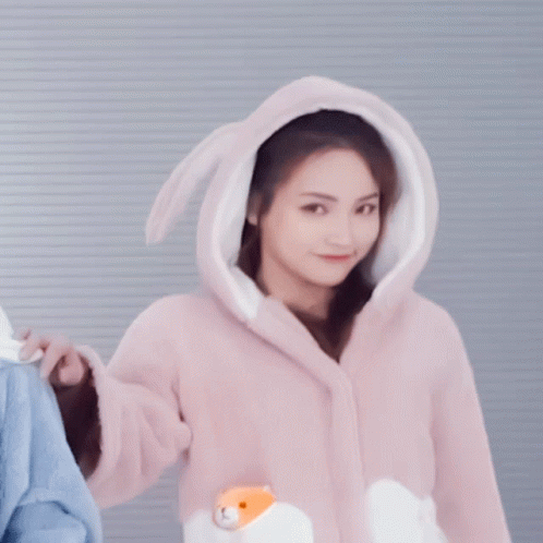 Xu Xinwen looking cute in pink bunny pajamas with a hooded design, smiling at the camera.