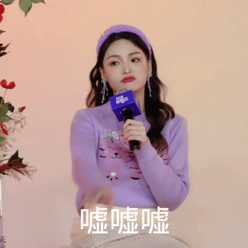 Xu Xinwen makes a 'shhh' gesture while holding a microphone, wearing a purple sweater and headband.