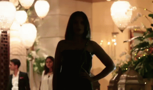 A woman in a stylish black one-shoulder dress poses confidently on a dimly lit runway, showcasing her outfit.