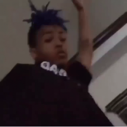 Xxx, a man with blue dreadlocks, points at the camera and raises his arms in a room.