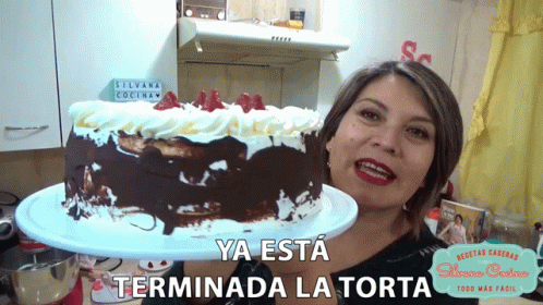 Silvana Cocina proudly presents her finished chocolate cake, beautifully decorated with white frosting and strawberries, ready to enjoy.