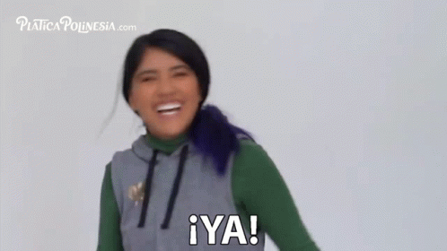 Karen Polinesia with purple hair laughing and exclaiming '¡YA!' (Enough!)