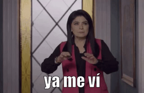 Woman in pink vest makes a funny face, expressing 'Ya Me Ví' (I can see myself in that situation).
