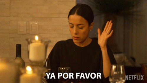 Paulina De La Mora (Cecilia Suarez) expresses exasperation at a candlelit dinner table, saying 'Ya Por Favor'.