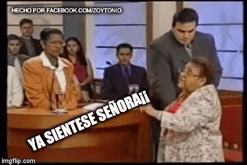 A man tries to get an older woman to sit down in a courtroom, with the caption 'Ya Sientese Señora!!'