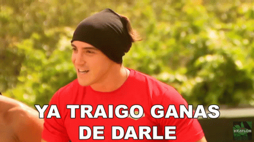 Man in red shirt and black beanie says 'Ya Traigo Ganas De Darle' from Exatlón México.