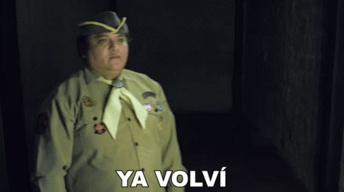 A person in a scout uniform announces 'Ya Volví' (I'm Back) in an Enchufe Tv sketch.