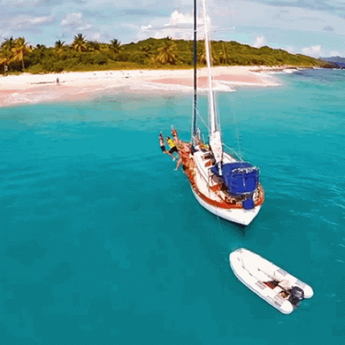 People enjoying a yacht charter, jumping into clear turquoise ocean water near a pink sand beach.