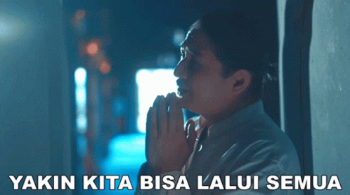 A man praying with hands clasped, reflecting on the lyrics 'Yakin Kita Bisa Lalui Semua' from Ungu's song.