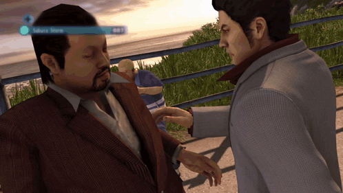 Kiryu Kazuma performs a powerful heat action on an opponent, Mikio Aragaki, in a Yakuza 3 street fight.