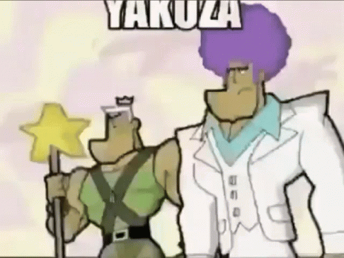 Cartoon characters dance energetically on a colorful floor, featuring a character with a purple afro and the text 'Yakuza'.