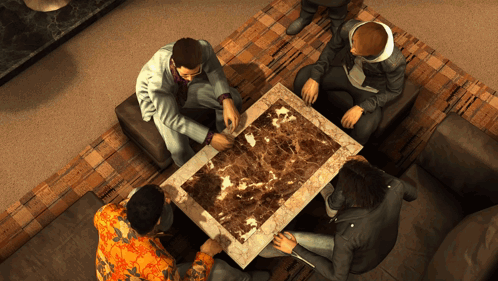 a group of people are sitting around a table with a marble top