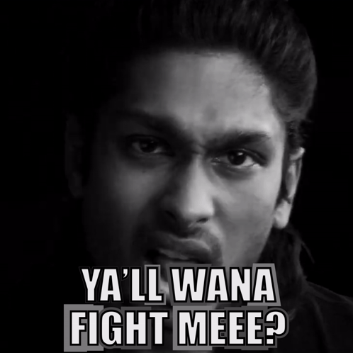 Ashwin Gane challenges viewers with an intense expression and the phrase 'Y'all Wana Fight Meee?' in a black and white clip.