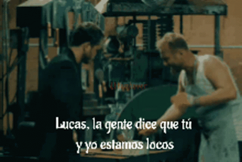Yamaç Senol and Lucas discuss being called crazy, as one man works in a workshop setting.