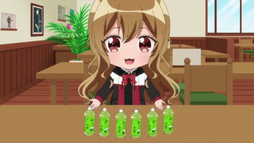 Yamate Kyoko from D4DJ Petit Mix happily presents six bottles of green tea.