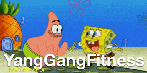 Spongebob and Patrick star in a funny meme with the text 'Yang Gang Fitness' on a blue background.