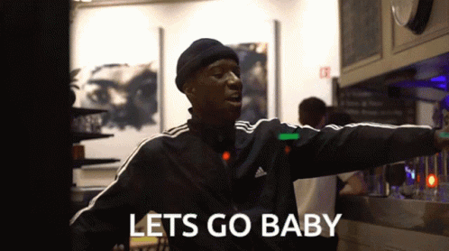 Man in Adidas jacket enthusiastically says 'Lets Go Baby' and dances in a lively setting.