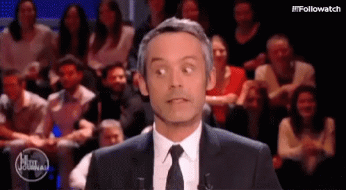 Yann Barthes makes a funny, wide-eyed face while hosting Le Petit Journal in front of an audience.