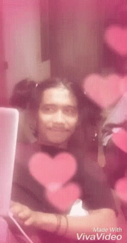 Yanprada Hsbyp smiles cunningly in front of a laptop, surrounded by a pink heart filter.