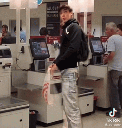 Yanzenie Polo Boy, wearing a black Nike hoodie and jeans, stands at a self-checkout counter with a Target bag.