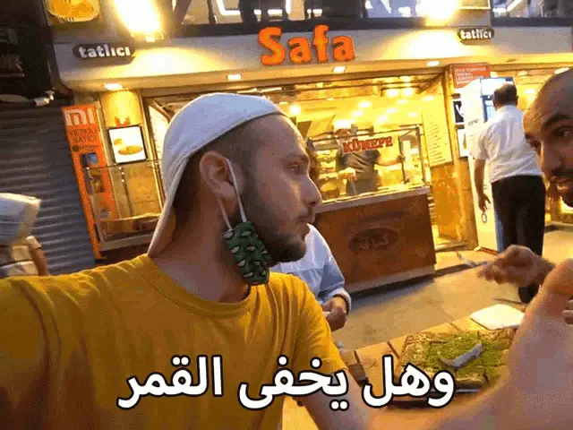 Qasim enjoying a delicious pistachio-covered dessert, exclaiming 'Oh my goodness!'